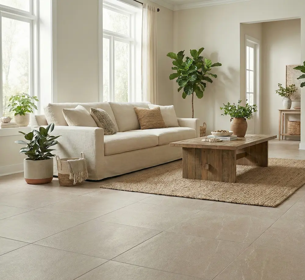Si busca que su salón parezca el doble de grande, el secreto está en el tamaño de la baldosa. El formato 100×100 cm reduce drásticamente la cantidad de líneas de corte en el suelo. Al haber menos «ruido visual», el cerebro percibe el espacio como más amplio y ordenado. Además, al ser un material rectificado, la instalación se realiza con una junta mínima (recomendamos 1.5 a 2 mm). Si elige una lechada del mismo tono Taupe, conseguirá un efecto «manto continuo» espectacular, donde el suelo fluye de una habitación a otra sin interrupciones.