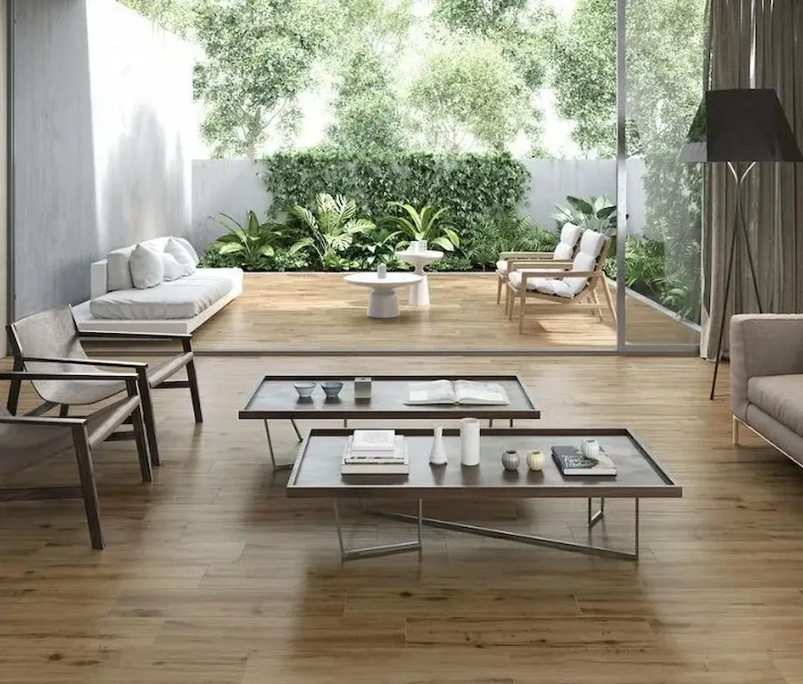 Su acabado rectificado (cantos cortados a 90º) permite una instalación con junta mínima (recomendamos 1.5 – 2 mm). Al usar una lechada del mismo tono que el roble, las juntas desaparecen visualmente, creando un manto continuo de madera que amplia la percepción del espacio.