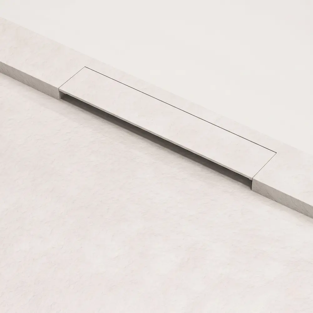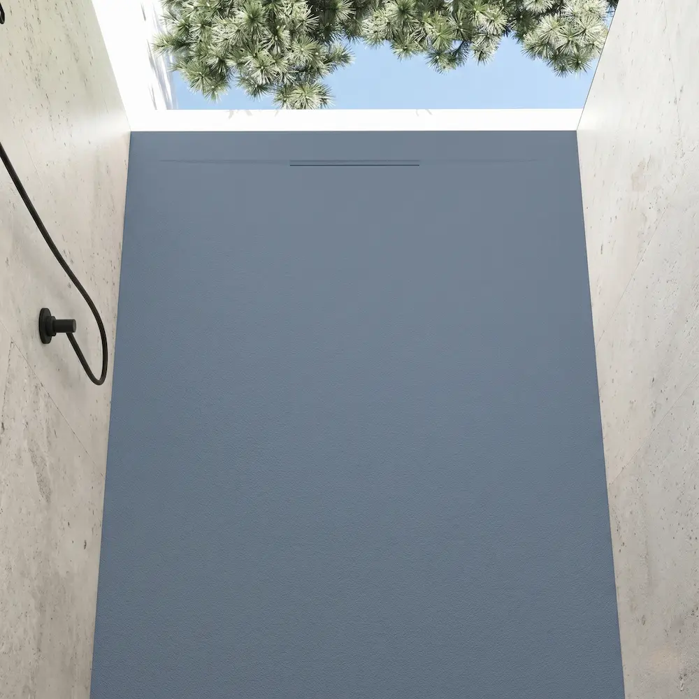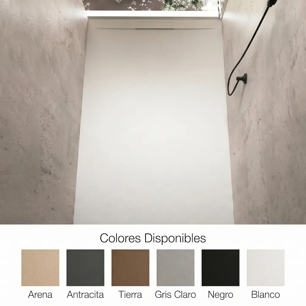 La versatilidad técnica de este modelo facilita el trabajo de los instaladores. El material permite que el plato de ducha se pueda cortar a medida directamente en la obra para sortear columnas o adaptarse a huecos irregulares. En cuanto a su colocación, admite dos tipos de instalación según las necesidades del proyecto: apoyado directamente sobre el suelo o integrado al ras del suelo para un efecto de continuidad total.