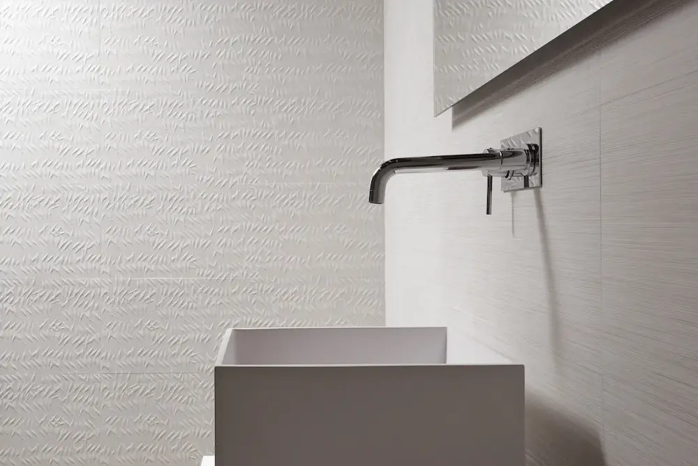Para conseguir este efecto de «pared vestida», la calidad del material es clave. Keraben fabrica esta serie en Pasta Blanca, lo que garantiza un color crema puro y sin impurezas. Además, al ser un azulejo rectificado (con los bordes cortados a escuadra perfecta), puedes instalarlo con una junta mínima de 1-2 mm. Esto es fundamental para que la textura lineal tenga continuidad y la pared se perciba como una superficie textil continua, limpia y elegante.