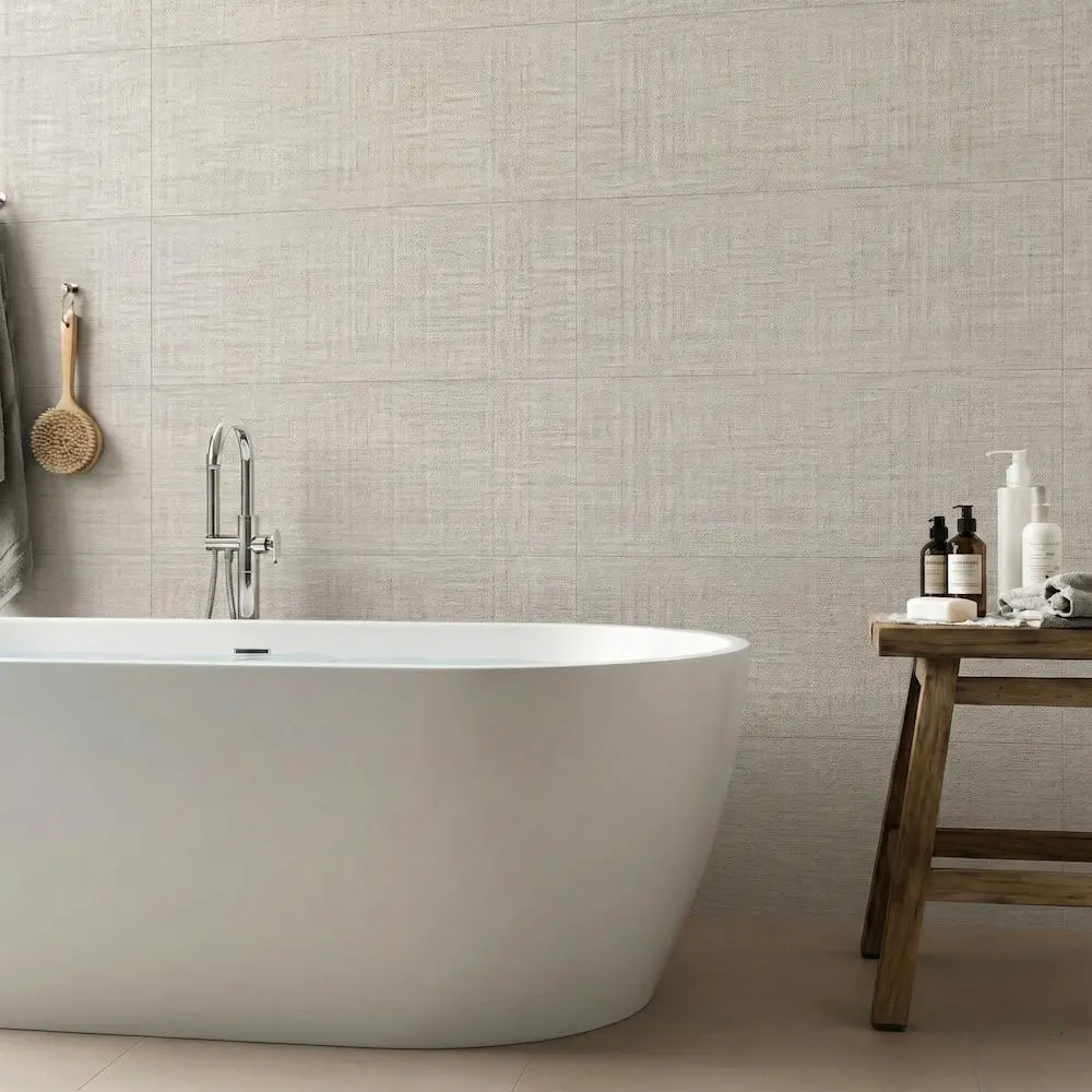 Este revestimiento no solo es bonito, es técnicamente superior. Fabricado en pasta blanca, ofrece una definición de color y textura mucho más pura que la pasta roja. Además, su acabado rectificado (cantos cortados a 90º) permite una instalación con juntas mínimas (1-2 mm). Esto es fundamental para que el efecto «textil» sea continuo y no se vea interrumpido por juntas gruesas, logrando una estética de papel pintado pero con la resistencia total al agua y la humedad de la cerámica.