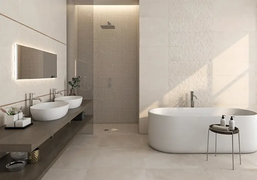 El Kalos Beige es increíblemente fácil de combinar. Fíjate en el ambiente de inspiración: queda espectacular con madera natural, griferías cromadas o accesorios en tonos tierra. Gracias a su formato alargado de 30×90 cm, tienes el poder de jugar con la percepción del espacio: colócalo en horizontal para ensanchar visualmente la pared o en vertical para ganar altura.