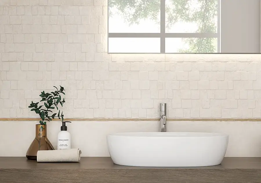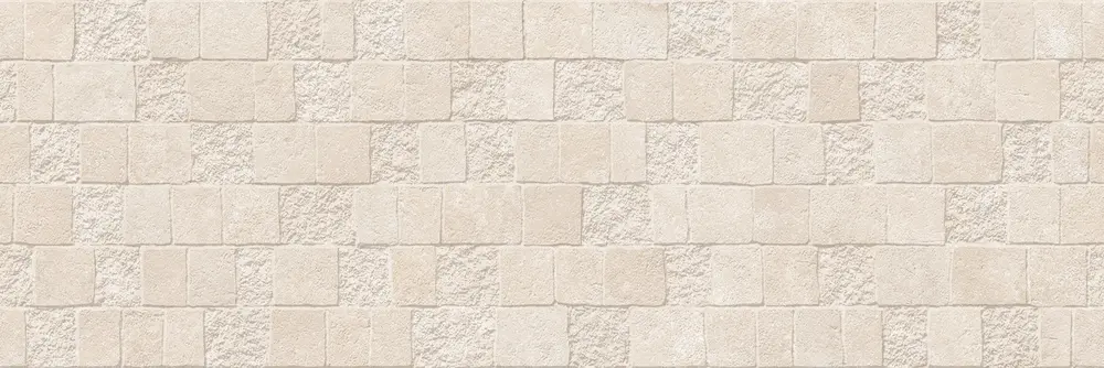 A veces, una pared lisa no es suficiente para expresar el carácter de tu hogar. El modelo Kalos Concept Beige 30×90 cm de Keraben nace para romper la monotonía. Imagina una pared que no solo tiene color, sino relieve y movimiento. Este azulejo recrea un mosaico artesanal compuesto por pequeñas teselas cuadradas de piedra caliza, cada una con su propia textura: unas más lisas, otras más rugosas, imitando el desgaste natural de la roca.