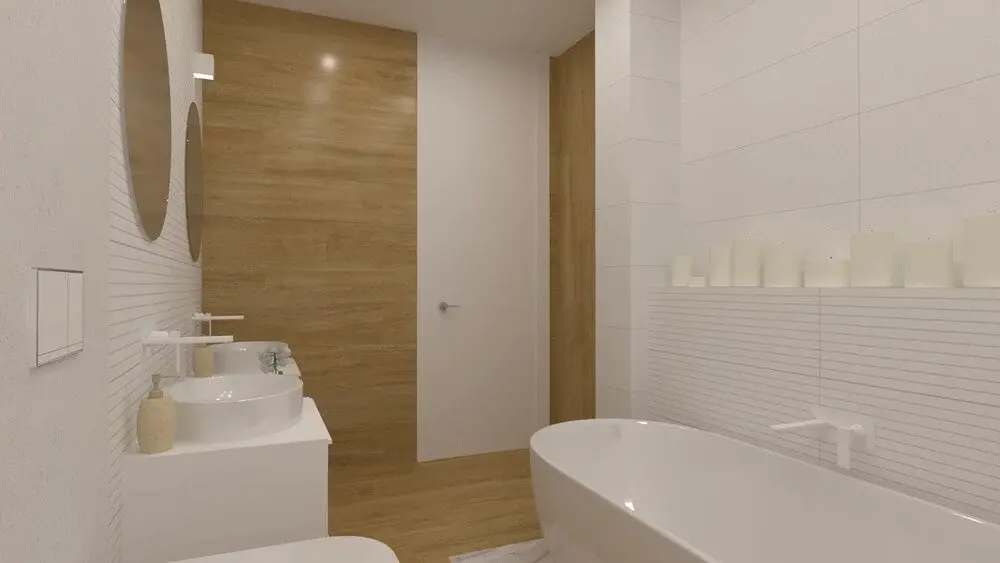 Es la opción perfecta si te gusta el estilo Minimalista Cálido o Japandi. Fíjate en cómo funciona en el baño de la imagen: las líneas del azulejo dialogan con la calidez de la madera del suelo y el mueble, creando un espacio equilibrado, limpio y muy arquitectónico.