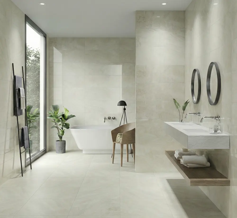 Al elegir este azulejo, consigues lo mejor de dos mundos: la limpieza y amplitud visual de los colores claros, y la fuerza decorativa de las texturas industriales. Es el fondo ideal para una cocina de diseño o un baño contemporáneo.