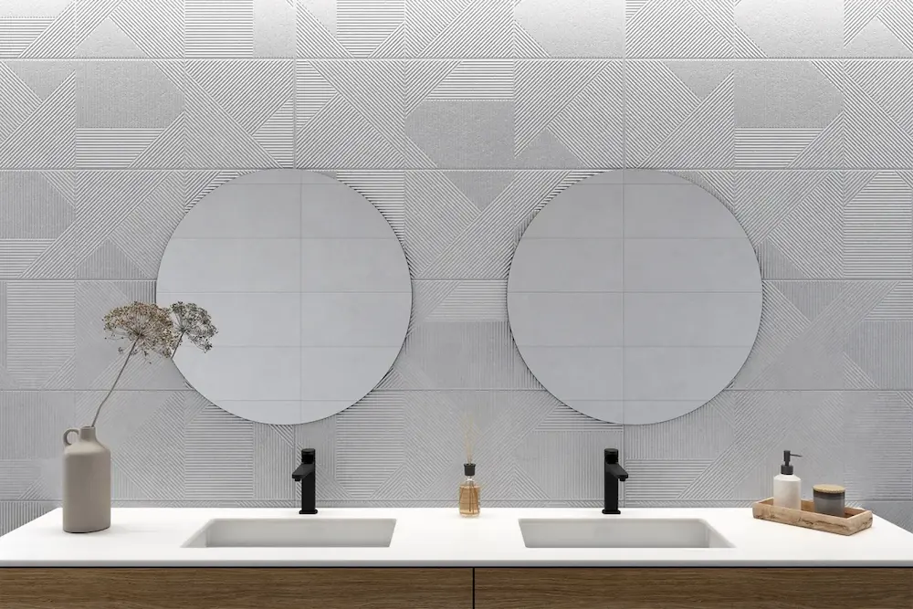 El secreto de un baño de diseño está en saber dónde poner el acento. Utiliza el Verse Concept White para destacar la pared de los espejos o el interior de la ducha. Al combinarlo con la base lisa Verse White en el resto de paredes, consigues un equilibrio perfecto: la base aporta calma y amplitud, mientras que el Concept añade dinamismo y punto focal.