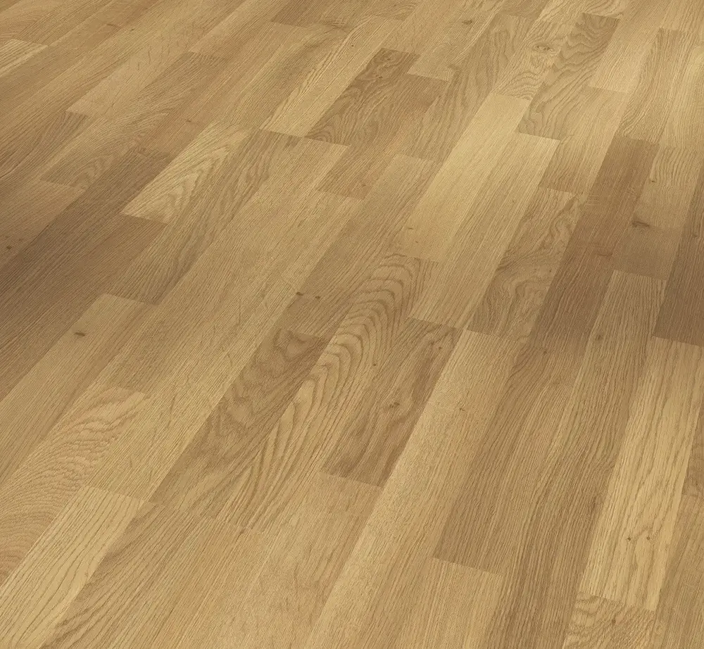 ¿Recuerdas esos suelos de madera llenos de matices y vida? El modelo Roble Natur 3 Tablillas, de la gama Basic 400 de Parador, recupera esa estética atemporal que nunca pasa de moda. A diferencia de las lamas anchas y uniformes, el diseño en 3 tablillas (tres tiras de madera en cada lama) crea un juego visual de tonos beige y dorados que aporta un dinamismo y una alegría únicos a tu hogar. Es la opción perfecta si quieres romper la monotonía y llenar de calidez tu salón o dormitorio.